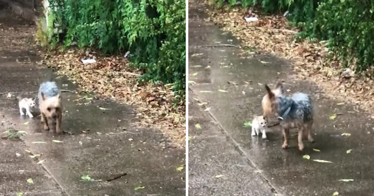 超暖約克夏雨中當小奶貓的「守護天使」 一路盯著牠:我帶你回家取暖!