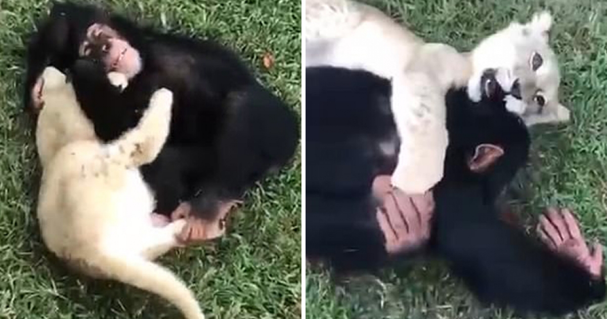 從小就認識! 黑猩猩+小白獅「成為好麻吉」 黑猩猩被撲倒「微笑擁抱」:輕一點啦~