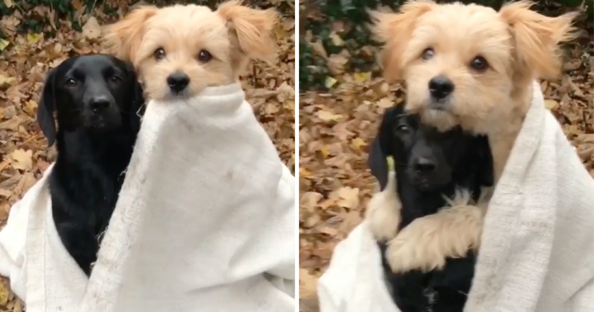 天生的模特兒! 萌汪拍照「嘴嘴叼浴巾」超會擺pose 快門前一秒「伸手手抱同伴」:拍可愛一點唷~