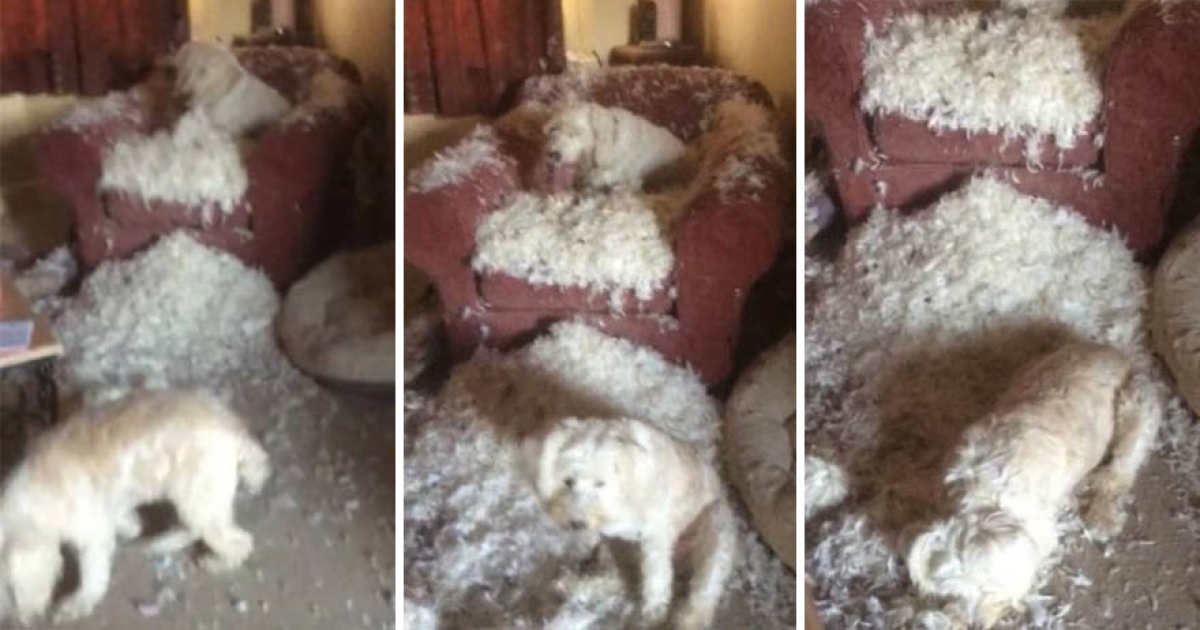 加完班回到家…調皮兩汪「咬爛肉色沙發」羽毛滿天飛 主人無奈:到底是餓多久?