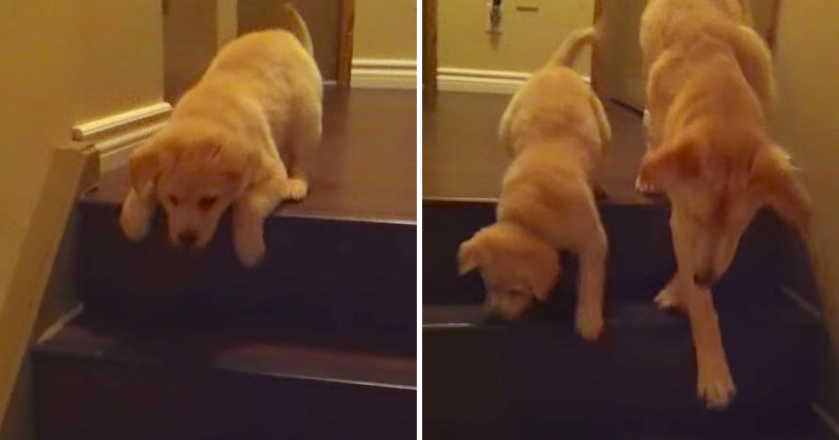 狗妹驚驚不敢下樓! 汪哥忙上前「手把手教學」:先伸這隻就對了~