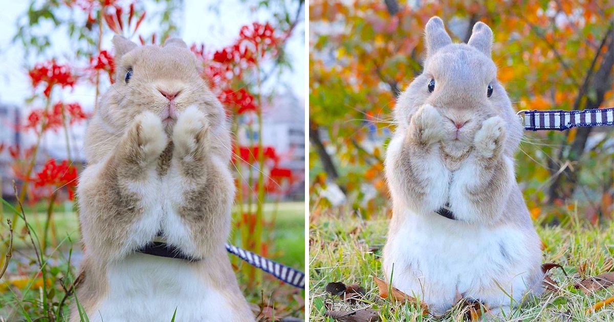 好驚訝的兔兔!外拍自動「捧起嘴邊肉」 坐主人手心也萌化:根本娃娃❤️