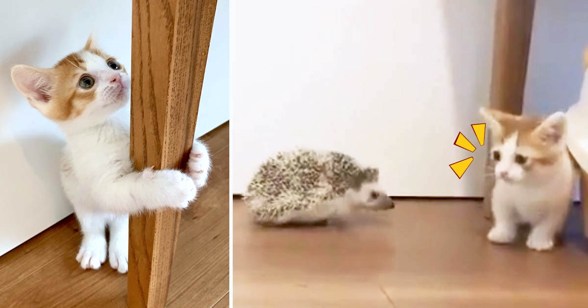 牠怎麼有刺?小奶喵初見刺蝟 嚇到「站起抱柱」:泥不要過來呀QQ