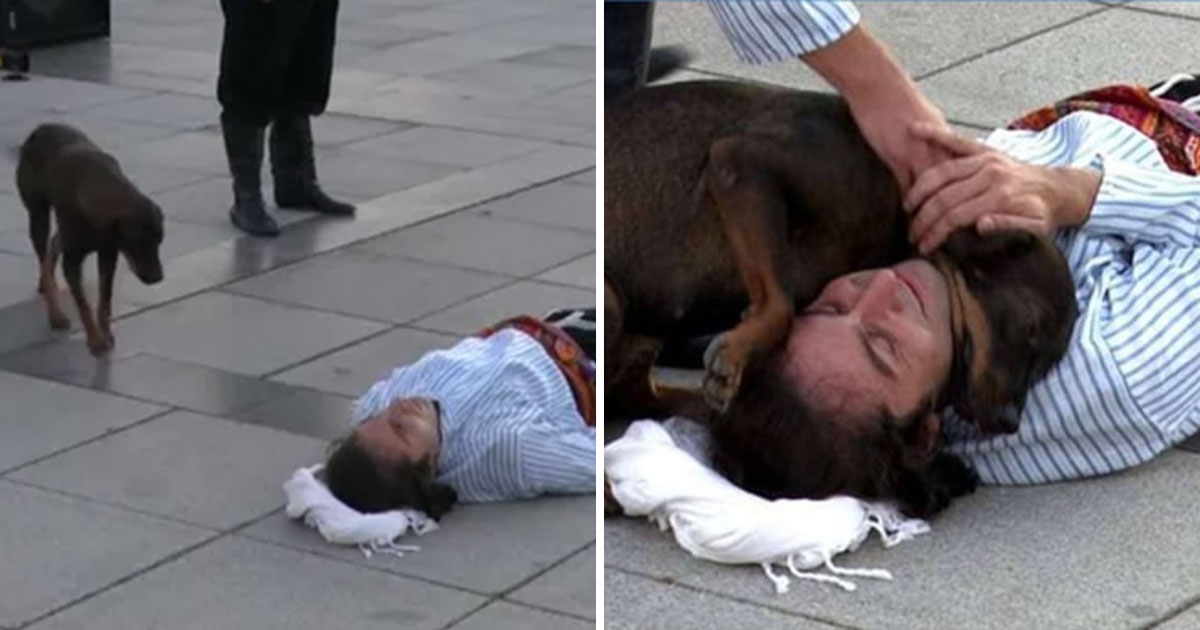 怎麼有人倒在路邊? 街頭藝人演戲「路倒」 暖心「浪汪小黑」衝上前:快救救他!