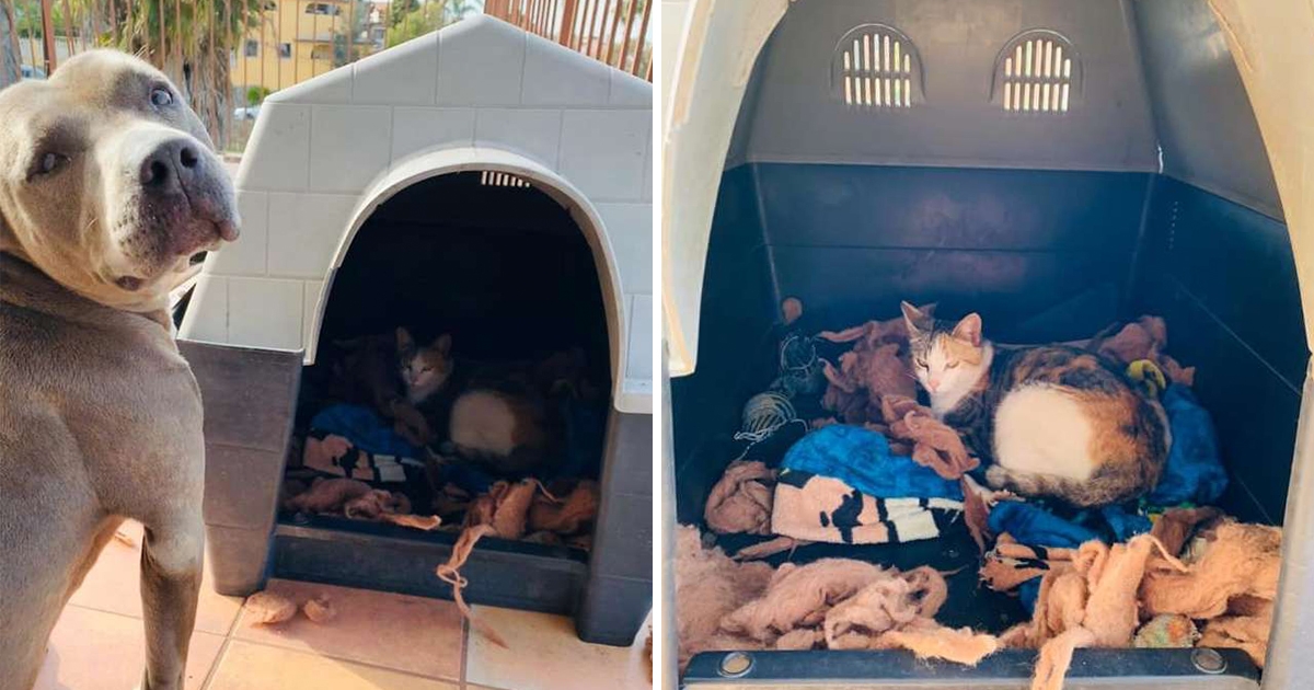 臉最兇的天使! 最溫柔比特犬「收留懷孕浪喵」 讓出狗窩當產房:你安心生寶寶~