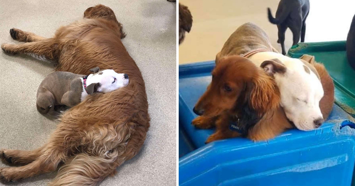 借人家躺一下~ 比特犬睏覺「把其他狗狗當枕頭」 小隻汪也不放過:這樣才好睡♡
