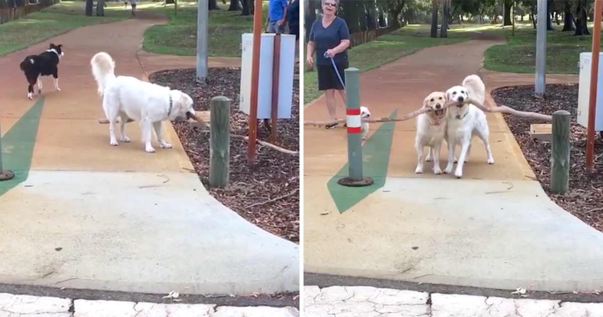 呆萌汪女兒「太想要大樹枝」卡住了 汪媽立刻衝去幫忙:女兒我來惹~