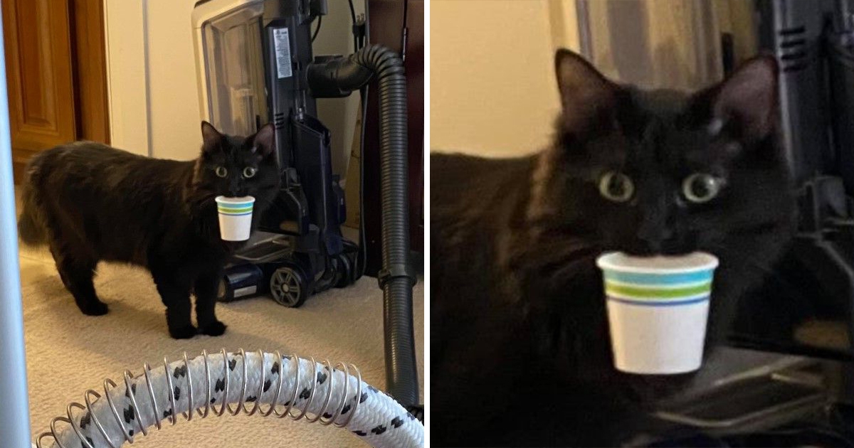 陌生阿姨來打掃衛生! 黑貓當家作主「叼紙杯」禮貌問候:要喝水休息一下嗎?