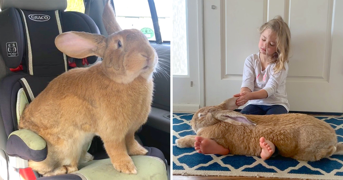 帶回巴掌小兔…養了卻跟女兒一樣大! 「超級巨兔」小姊姊直接當枕頭躺❤️