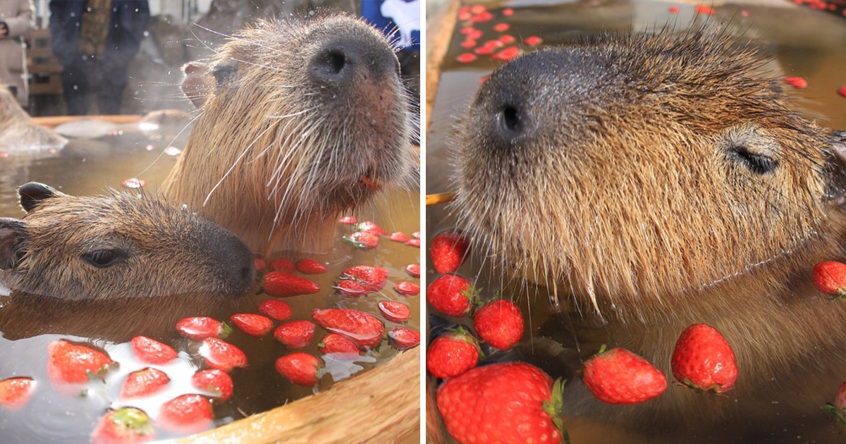 在泡甜湯~水豚「洗草莓浴」酥湖到瞇瞇眼 網:過得不如一隻水豚