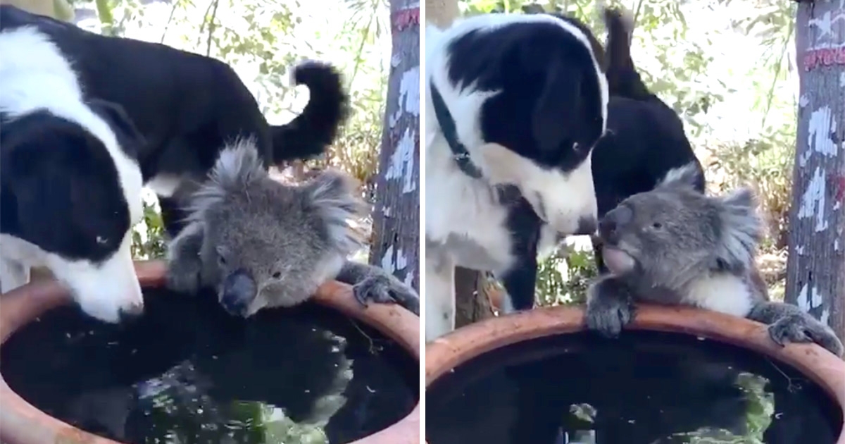 無尾熊口渴跑後院喝水 汪汪不趕走「還溫柔注視」:多喝點~