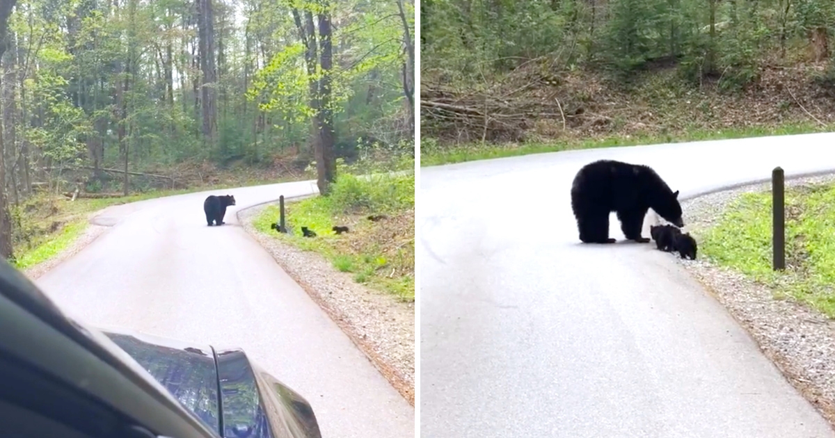 帶4顆「小煤球」過馬路! 黑熊媽還回頭「點點名」:都跟上不要掉隊喔~