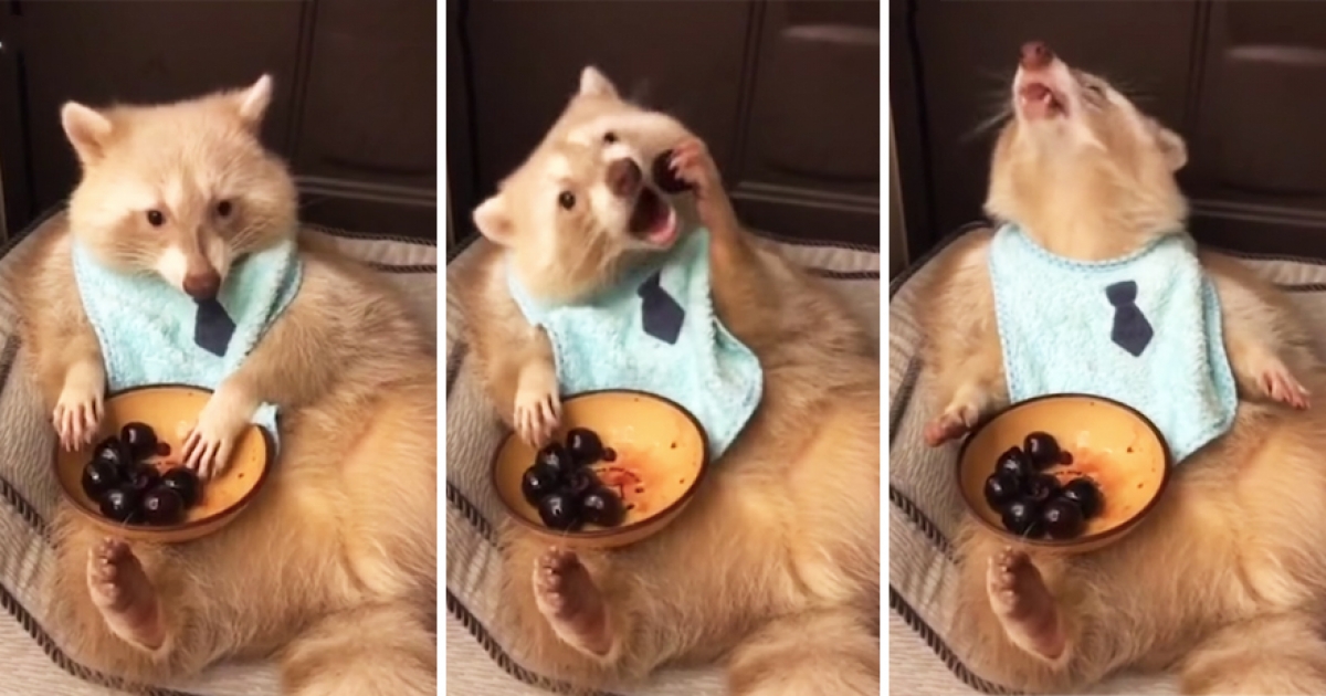 有櫻桃就有好心情~ 可愛浣熊「躺沙發爽吃」慵懶模樣萌翻網友心