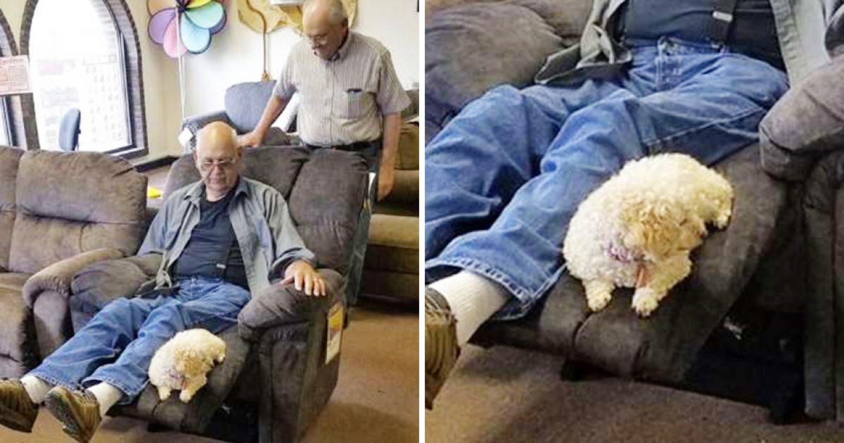 老爺爺買家具帶著毛孩「試沙椅子」 唯一條件:一定要塞得下我們兩個