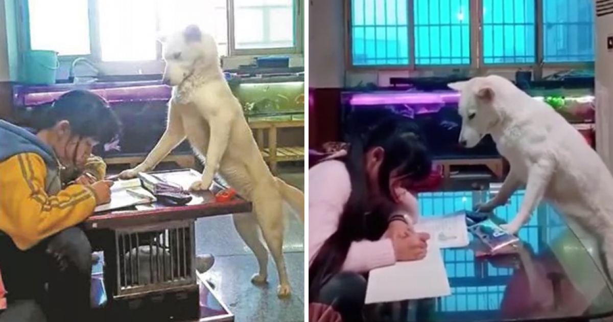 主人訓練愛犬「幫忙盯女兒寫作業」 汪星人一臉認真:快點寫完它啦