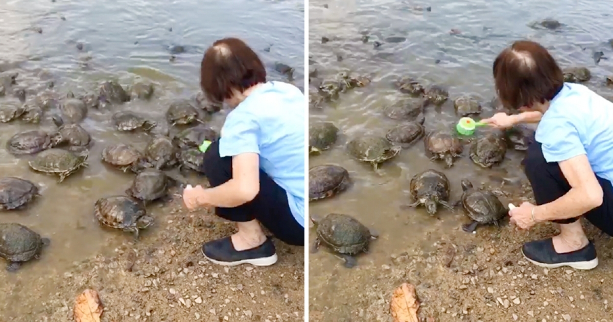 小烏龜集體排隊享受「刷背服務」 阿姨蹲池塘邊:好好好~我都刷唷~
