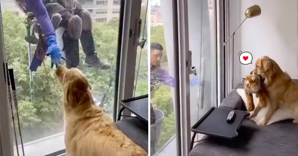 金金發現「洗窗小哥」以為是來跟牠玩的! 忙叼玩具萌問:要不要一起~
