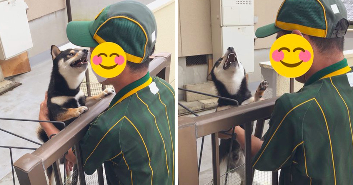 意圖使人想送貨!柴柴趴欄杆「喜迎快遞員」 瞇眼微笑:叔叔你又來惹~