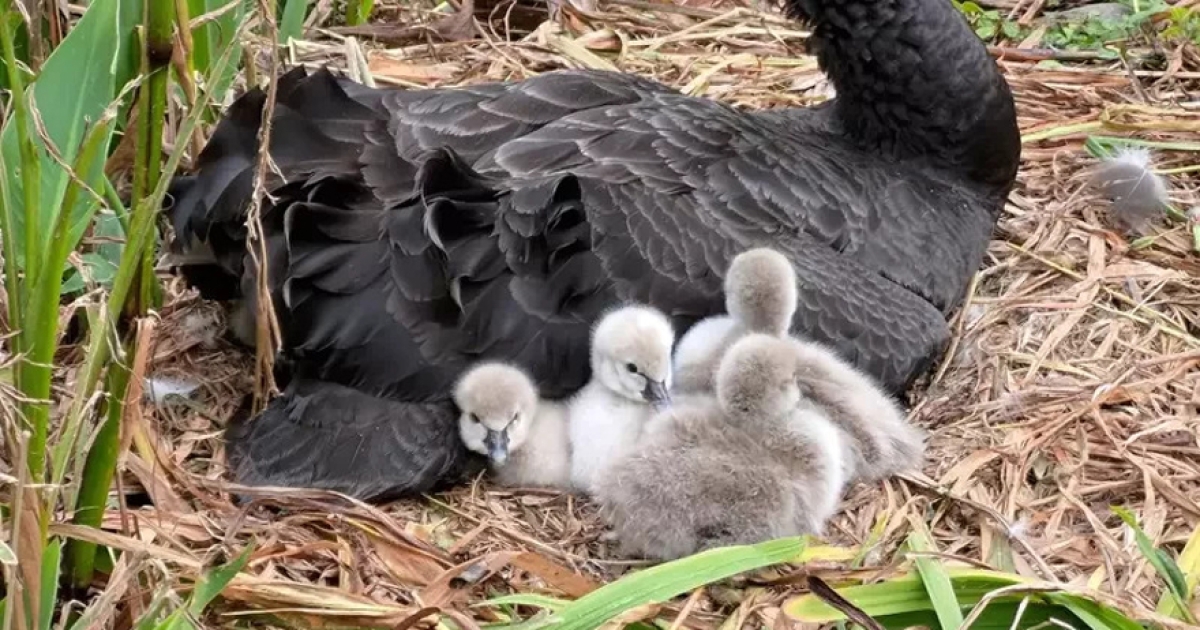 台中秋紅谷有喜!母黑天鵝「下蛋孵化成功」 迎來5隻小天鵝