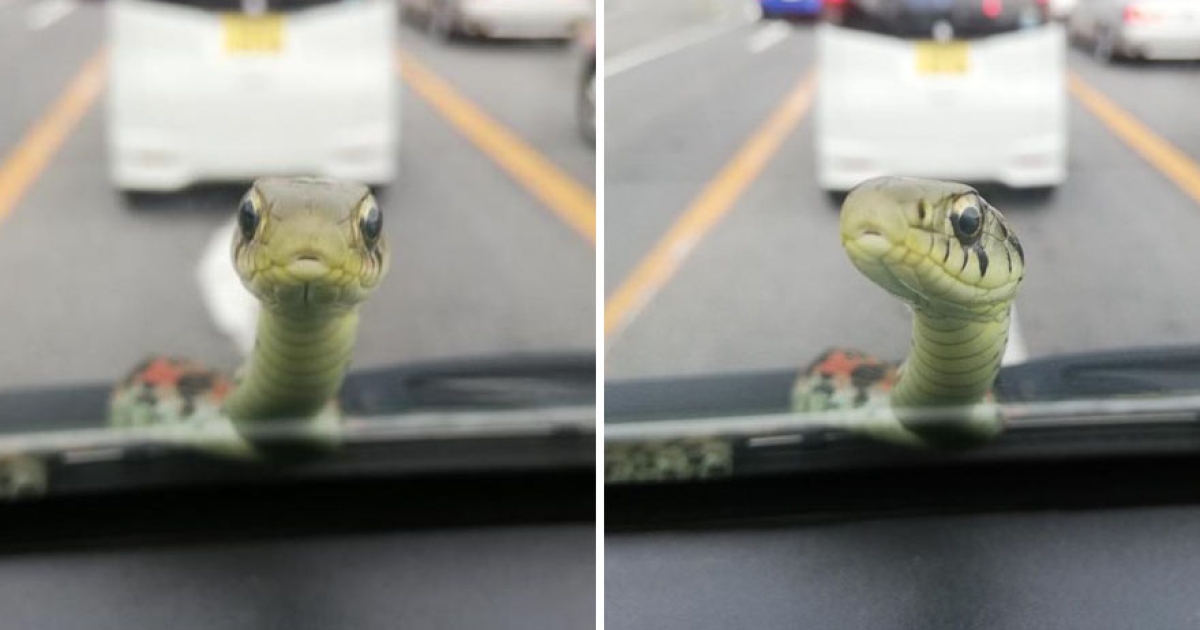 開車途中擋風玻璃「冒出一隻小蛇」! 牠超呆萌轉頭:泥要載我去哪裡?