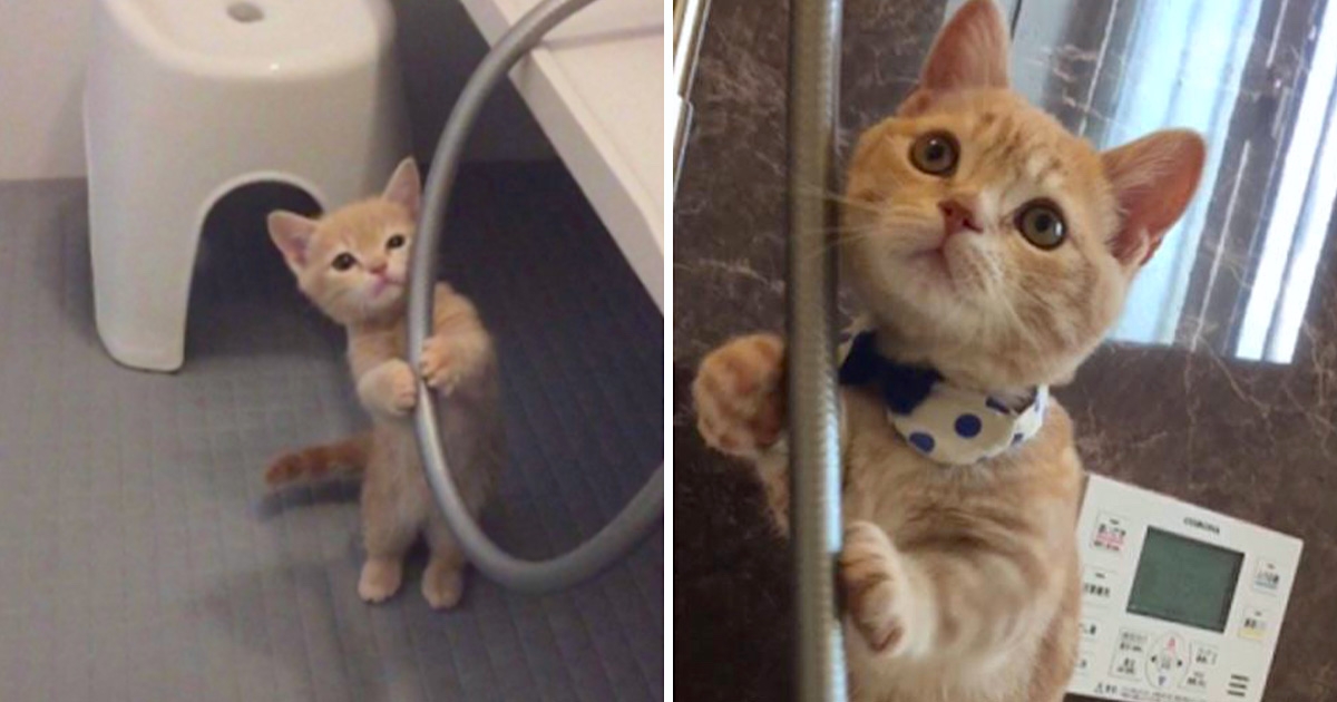 可以鼻要洗澡嗎? 奶橘喵緊抱水管「無辜電波求主人」:倫家真的很乾淨啦~