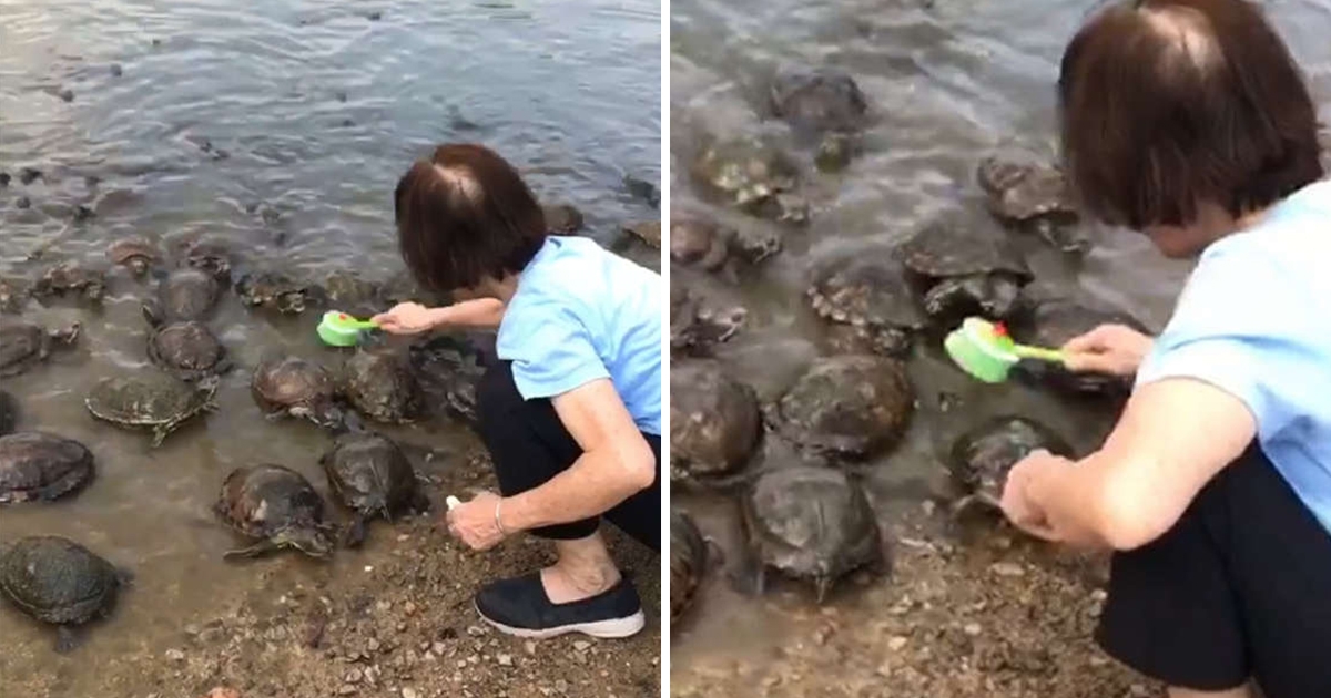 見岸邊阿姨帶著刷子… 池子烏龜「超激動上岸」:來幫我們刷背的!