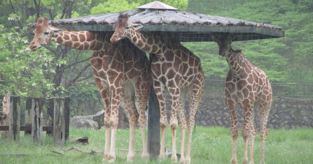 脖子太長!長頸鹿姐妹花「屋簷躲雨」頭遮不住 滿臉呆萌:怎麼還是濕濕的捏?