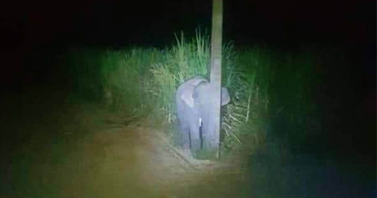 天真小象偷吃甘蔗被抓包 「急智」躲電線桿後:你看不到偶!