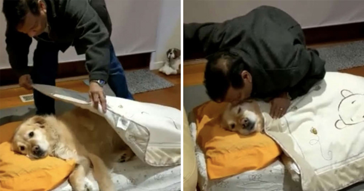 老爸當初「堅決反對養狗」 如今「啾一個幫蓋被」伺候愛汪午覺:不要著涼喔♥