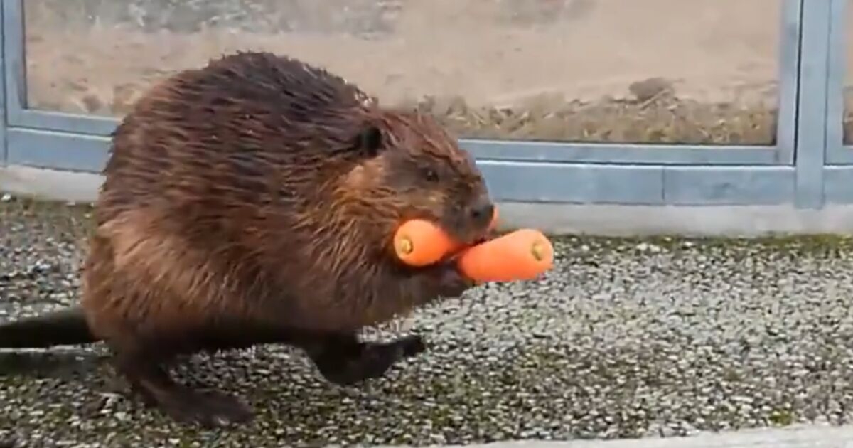 手手拿不動!河狸爸「用嘴外帶紅蘿蔔」 蹦跳回家:趕快給老婆小孩吃~