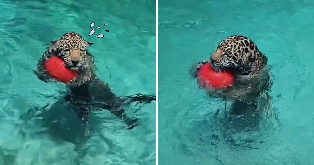 怕豹!美洲豹玩水「踩不到底」臉好囧 小短腿「緊抱球球」:鼻要離開偶~