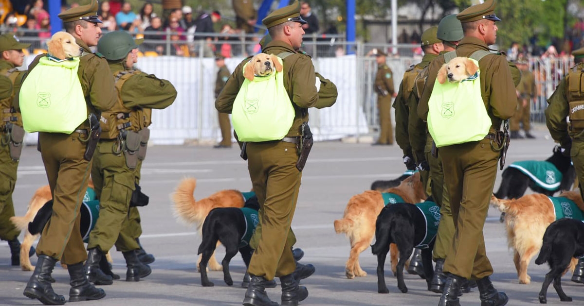 國慶閱兵!幼幼警犬「坐背包遊行」 萌露小臉憨笑:前輩都好酷~